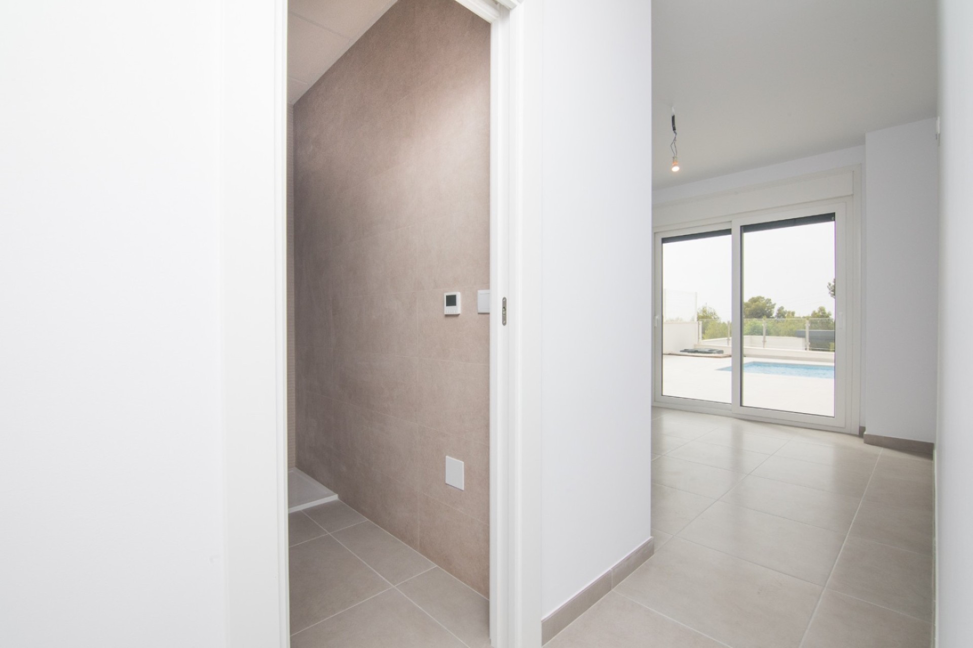 The practically designed villa offers all living spaces on one level, featuring a living and dining room with a fully equipped open kitchen that provides direct access to the terrace with a private pool. On this same level, there are three bedrooms and two bathrooms, one of which is en-suite to the master bedroom.
