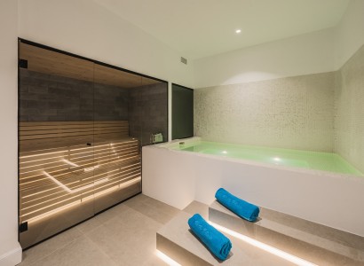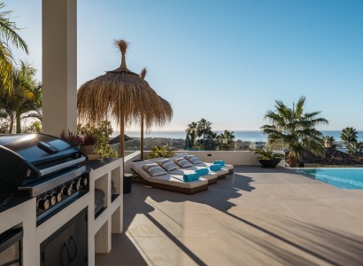 A private elevator allows convenient access to all floors of the villa. On the ground floor, there is a bright open-plan living room connected to an elegant dining area and a modern fully-equipped kitchen with a central island and seating. This level also includes a pantry, office, an en-suite guest bedroom and a multipurpose room. Large sliding doors flood the interior spaces with natural light and lead out to the exterior, which features a spacious terrace, outdoor kitchen, outdoor dining area and a luxurious infinity pool.