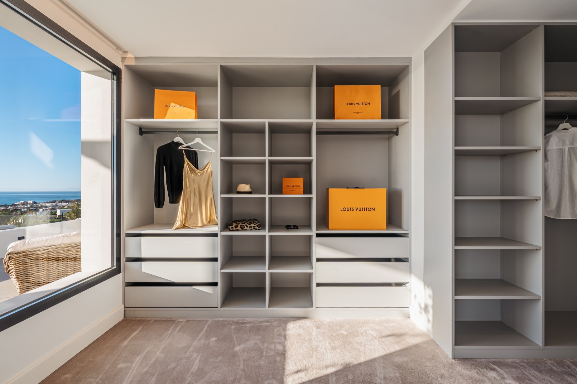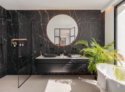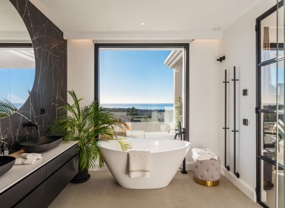 On the first floor, the master suite offers a private en-suite bathroom, including a freestanding tub oriented to enjoy the views, and access to a large private terrace.