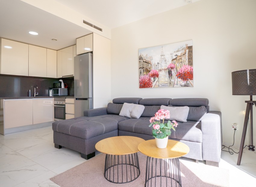 This first-floor apartment in a duplex building enjoys panoramic views over the Benidorm skyline and the Mediterranean Sea.