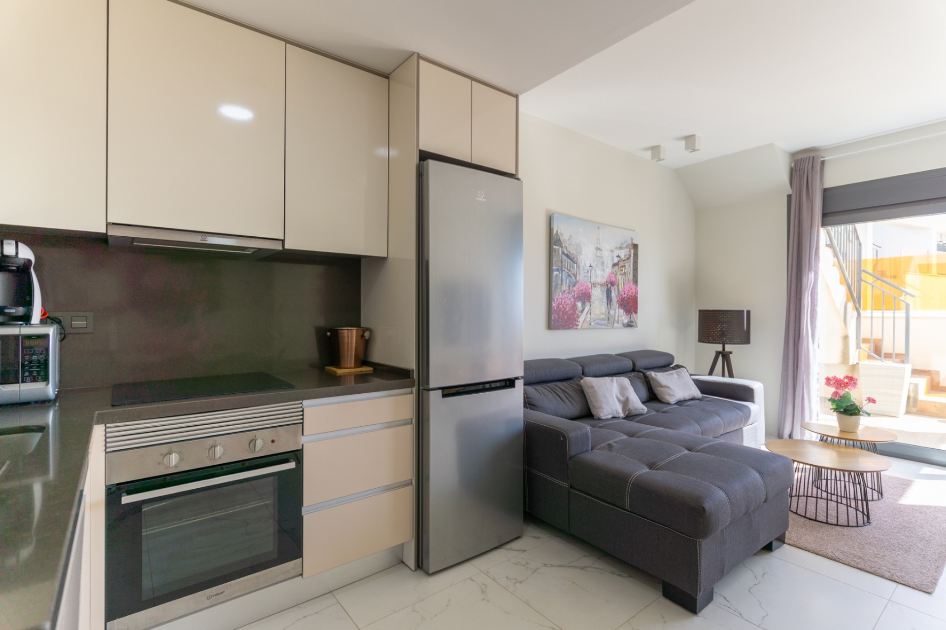 The main level features three bedrooms and two bathrooms, including a master bedroom with en-suite. One of the bedrooms also has access to a private, small terrace. The bright and open-plan living and dining area is connected to a fully equipped kitchen. From the living room, sliding doors open onto a south-facing terrace with beautiful sea views and views over the communal gardens and swimming pools. A staircase leads from this terrace to a spacious private rooftop solarium offering 360-degree views of the sea and surrounding mountains. This upper terrace includes a built-in barbecue and a storage area with washing machine.